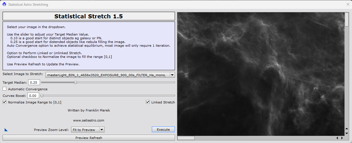 Star Stretch will take your linear stars only image and stretch it up to a non-linear state, boost the star colors, and remove any green hue cast. The stars only image will then be ready to combine with your starless image (usually done by screening).